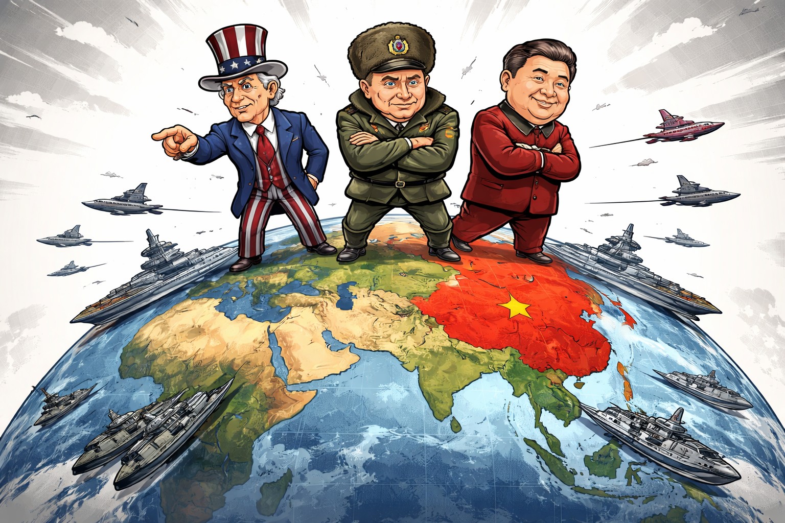 The United States, Russia, and China each now control large geographic spheres with overlapping areas of tension. Europe, ever so sclerotic, sits in between with no unified military power necessary to help shape events.